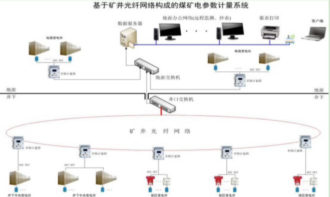 目前各个煤矿内部已经具有覆盖全矿井的工业光纤网络。因此,借助于现有的通讯网络,采用先进的智能电量测量技术、数据库技术、光纤网络通讯技术,对全矿用电设备用电量进行远程集中监测,实现变电所各类开关、动力设备的用电高精度计量;远程实时监测各路电参数;远程抄表;远程监控重点用电设备的运行状况;自动生成各种报表,所有数据网络共享,使管理者可以详细直观的掌握整个供电工区的设备用电状况、电力负荷分布等,为用电管理提供决策参考。电量数据通过内部网络实时发布,提高煤炭生产用电管理自动化水平,实现管、控一体化,推进煤矿智能化。图1为系统网络图。