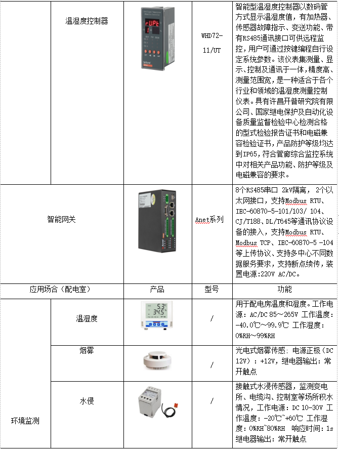 环境监测包括温湿度、烟感温感、积水浸水、可燃气体浓度、门禁、视频、空调、消防数据的采集、展示和预警,同时也可接入管廊舱室内的水泵和通风排烟风机等设备集成的第三方系统完成管廊环境综合监控。