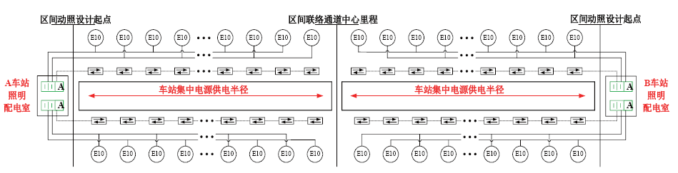 (1)方案一。将用于区间照明的集中电源全部设置在邻近车站站台层照明配电室,邻近两个车站的集中电源各负责为半个区间的灯具直接配电,如图1所示。这种方案主要考虑蓄电池运行环境,设置于照明配电室利于通风和自动灭火。在国家标准编制组的相关答疑中,建议集中电源设置在车站范围内,因此部分线路采用的方案为将集中电源设置在车站配电室,直接向区间的应急灯具供电。但这种方案运用在长、大区间时,集中电源的供电半径较大、线缆截面较大、回路较多;且部分车站设置了配线,配线区不一定设置照明配电室,照明配电室距区间起终点的距离可能达100~200m,进一步变大了区间灯具供电线路的截面。