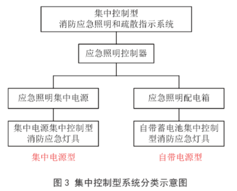 《消防应急照明和疏散指示系统技术标准》(GB51309-2018)第3.3.1条规定,灯具的电源应由主电源和蓄电池电源组成,且蓄电池电源的供电方式分为集中电源供电方式和灯具自带蓄电池供电方式。根据灯具蓄电池电源供电方式的不同,集中控制型系统分为集中电源型和自带电源型,如图3所示。