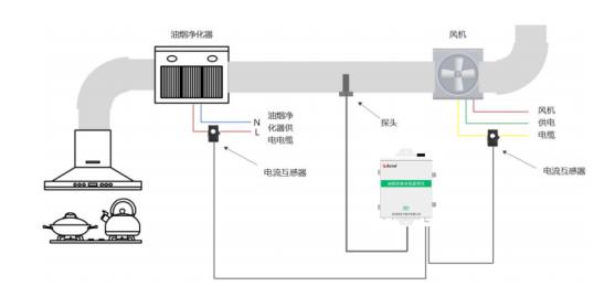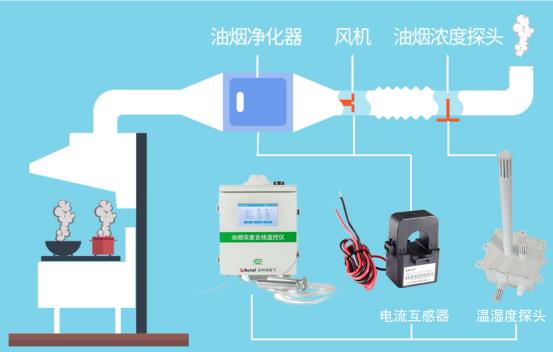 现场安装油烟在线监控仪,实时监测排烟烟道内的油烟、颗粒物和非甲烷甲烷总烃等浓度,同时对油烟净化器和风机的运行电流和开关状态进行监测,一旦排放超标,系统会发出告警信息。