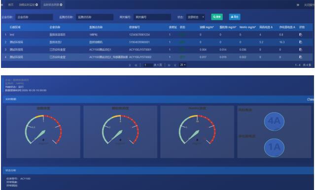 实时监测数据包括油烟净化器和风机的运行电流,油烟浓度、颗粒物浓度和NMHC浓度等信息。