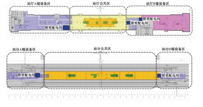 以南方城市某在建地铁站为例,本站为标准岛式二层车站,站厅层建筑面积为5648m2,站台层建筑面积为2136m2。站厅、站台中部区域为公共区,两端为设备房区域。公共区装修吊顶高度为3.2m,设备区无吊顶,灯具安装高度为2.8m。