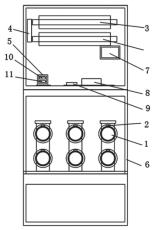 图1为一种用于小车式开关柜无线测温系统的结构组成,包括设于小车动触头套管1上的温度传感器2以及设于端子箱模块3上的电流传感器4,温度传感器2和电流传感器4均分别连接有数据接收处理器5,数据接收处理器5电连接有设于小车式开关柜6上的显示屏7;数据接收处理器5连接有通信模块8,通信模块8连接有远程报警单元9;远程报警单元9电连接有终端设备。其中,数据接收处理器5包括相互电连接的数据接收单元10和数据处理单元11。另外,数据接收单元10包括温度数据接收单元、电流数据接收单元,温度数据接收单元及电流数据接收单元均分别与数据处理单元11相连。其中,数据处理单元11与通信模块8相连。另外,温度传感器2为绑扎式温度传感器,绑扎式温度传感器套设于小车动触头套管1上。其中,温度传感器2 为绝缘性温度传感器。