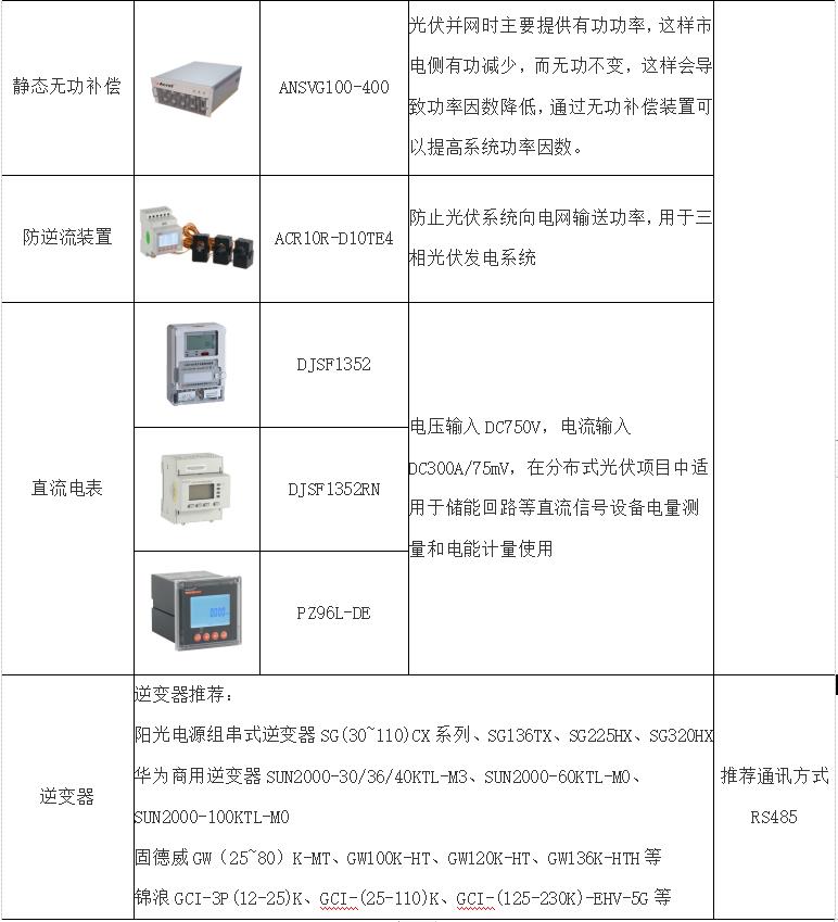 上图为一个1MW分布式光伏电站的示意图,光伏阵列接入光伏汇流箱,经过直流柜汇流后接入集中式逆变器(直流柜根据情况可不设置),最后经过升压变压器升压至10kV或35kV后并入中压电网。由于光伏电站装机容量比较大,涉及到的保护和测控设备比较多,主要如下表: