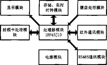 智能集中控制器包括处理器模块、RS485通讯模块、红外通讯模块、射频卡处理模块、存储/实时时钟模块、显示模块和电源模块等。