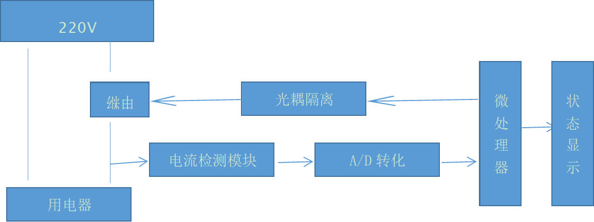 恶性负载检测系统由电流检测模块和AD转换模块及单片机处理模块等共同构成的,电流检测模块主要是在进行电流回路中的电流经电流互感器采样之后,使得其转化为电压,随后整流滤波。A/D转换模块是对之前所具有的电压信号采样处理,将采集到的信号传输到单片机中,然后经过单片机对采得的信号处理后加以判断。由于学生宿舍的大部分电器都不属于大功率电器,因此能够正常的工作,只有在单个的接入功率超出设定数值的时候才可以识别恶性负载。而如果检测为恶性负载也不会马上就断电,因为可能是电网中的干扰或小功率电器产生的过冲,只有多次检测之后才可以使得控制继电器断开,对回路供电切断处理,而如果需要手动恢复供电,就需要按下复位按钮。其系统结构框图如图1。