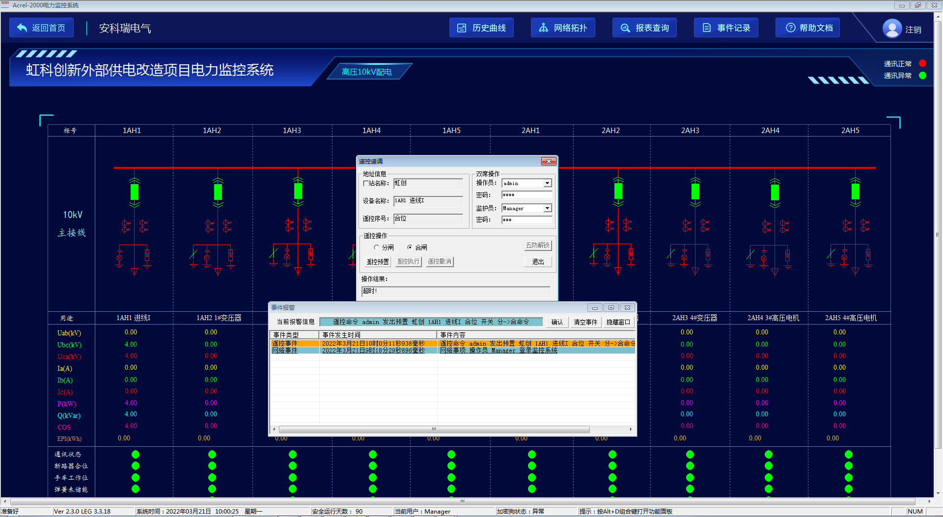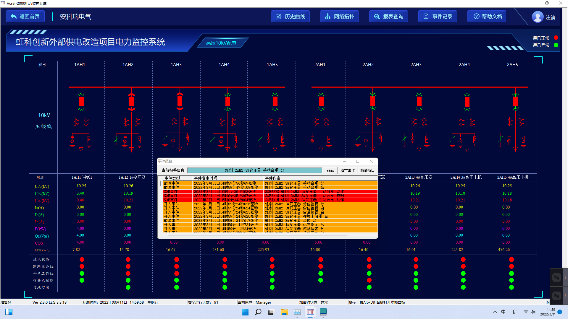 Acrel-2000电力监控系统可以直观显示一次系统图,并实时显示10kV电压等级各回路的遥测量、遥信量和报警信号等。遥测量包括电压、电流、功率、功率、电能等电参量等;遥信量包括中压开关柜内路断路器、手车、隔离开关、负荷开关、地刀开关的分合状态、断路器弹簧储能状态及远方就地控制状态;报警信号包括微机保护装置的告警信号、保护跳闸信号及装置异常信号。