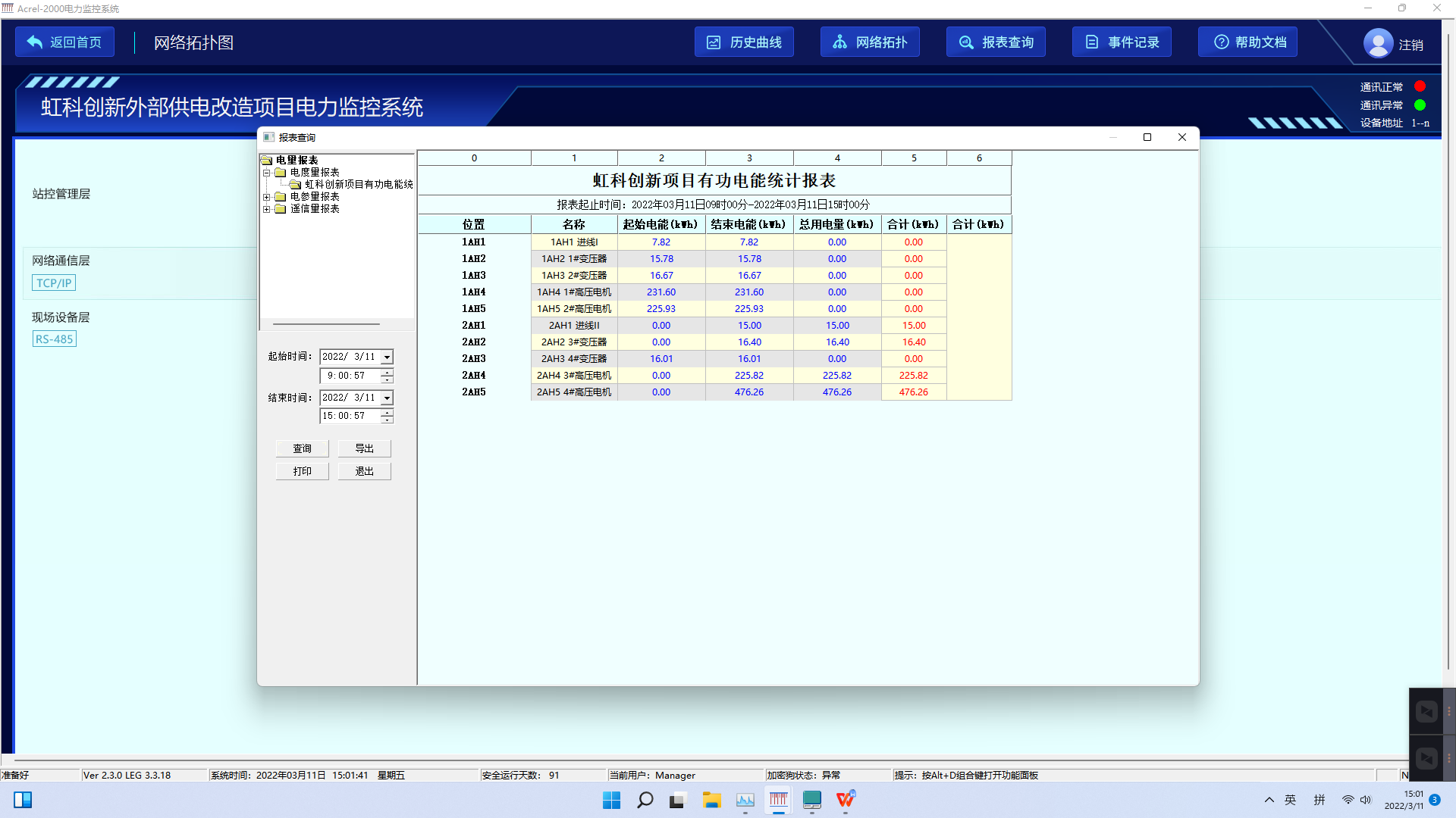Acrel-2000电力监控系统具备定时抄表汇总统计功能,用户可以自由查询自系统正常运行以来任意时间段内各配电节点的用电情况,即该节点进线用电量与各分支回路消耗电量的统计分析报表。