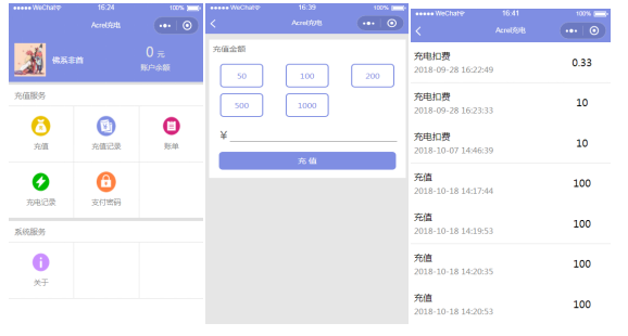 个人信息可以显示当前登录账号的昵称和余额,同时包括、充值、充值记录查询、账单查询、充电记录查询、设置支付密码等功能