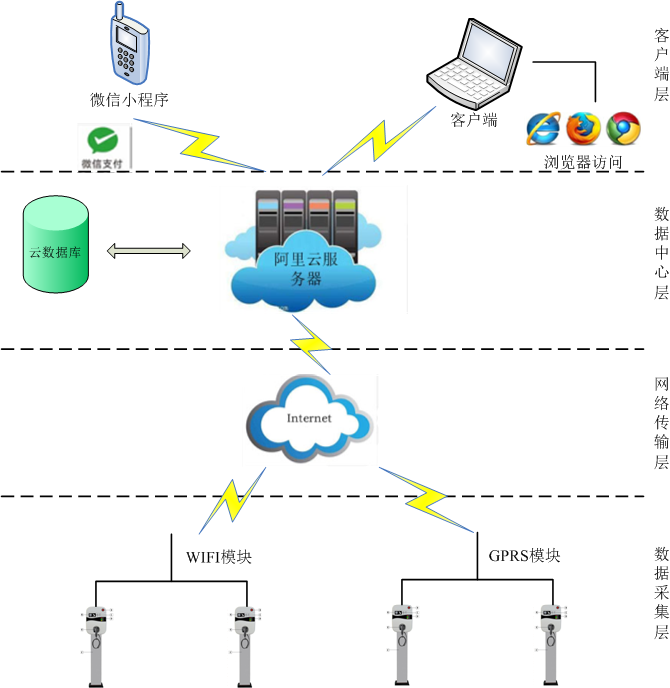 开云官方端网站登录入口Acrelcloud-充电桩收费运营云平台系统通过物联网技术对接入系统的充电桩站点和各个充电桩进行不间断地数据采集和监控,同时对各类故障如充电机过温保护、充电机输入输出过压、欠压、绝缘检测故障等一系列故障进行预警;而用户通过微信小程序扫描二维码,进行支付后,系统发起充电请求,控制二维码对应的充电桩完成电动汽车的充电过程。