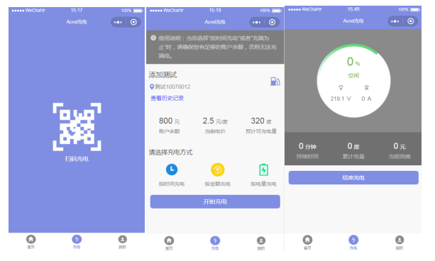 扫描充电枪上的二维码,如果当前充电桩可用即可进入充电选择页面,可以查看到当前的充电站名称、充电枪名称,以及当前的账户余额,电价和预计可充电量等数据,还可以查看当前账户的历史充电记录。充电方式分为按时间充电、按金额充电、按电量充电这三种方式。充电结束可以进进行评价。