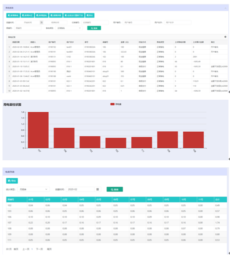 能耗分析:用户和管理员都可查询预付费表或管控表每天的用能状况;可提供能耗分析+财务轨迹一体式综合管理报表,包含用户表的能耗、财务数据、能耗和财务的期初期末值等数据。