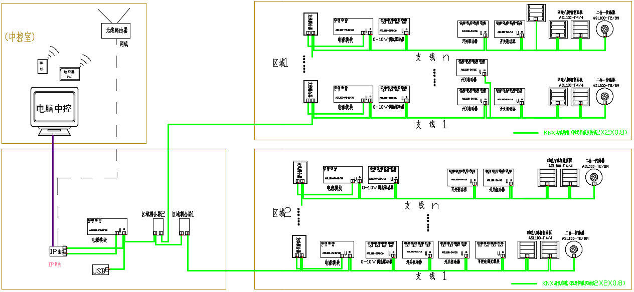 (4)系统采用分布分布式KNX总线结构,搭建简单灵活,系统内各模块互不影响,可独立工作,可靠性更高;