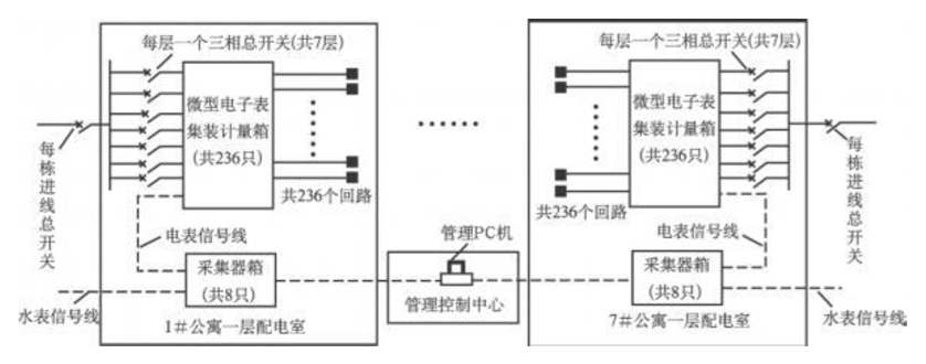 每栋公寓每个房间的电表集中安装在一层配电室的计量箱内,采用的是DDS395型单相电子式电能表,用于测量额定功率为50HZ,额定电压为220V的单相交流有功电能。该表具有集抄管理功能。用电量数据通过和水表数据采集共用的采集器进行采集,该采集器具有集控、预付费管理、用户过载断电等功能。系统示意图如图2所示。