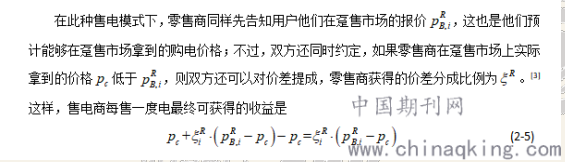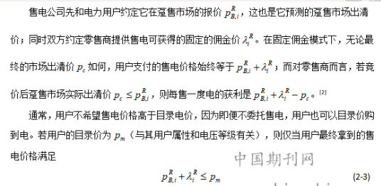 时,售电才能达成。 可见,在固定佣金的模式下,一旦约定了固定佣金价格,用户不再受到趸售市场价格波动的干扰;而售电公司还将面临趸售市场是否竞价成功以及出清价能否低于报价的风险,当出清价低于报价,则售电公司可因成功的报价行为而获得更多的收益。
