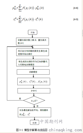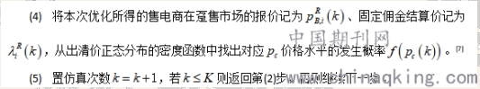 模型中带有随机变量,它表示趸售市场出清价。为获得能使电力零售商在售电协议期期望收益的报价策略和协议结算参数,采用蒙特卡洛法对趸售市场出清价进行仿真,并在每种出清价水平下实施报价和协议结算参数的优化计算,将所得结果按市场出清价水平出现的概率做加权平 均,从而获得期望收益的报价和协议结算参数。