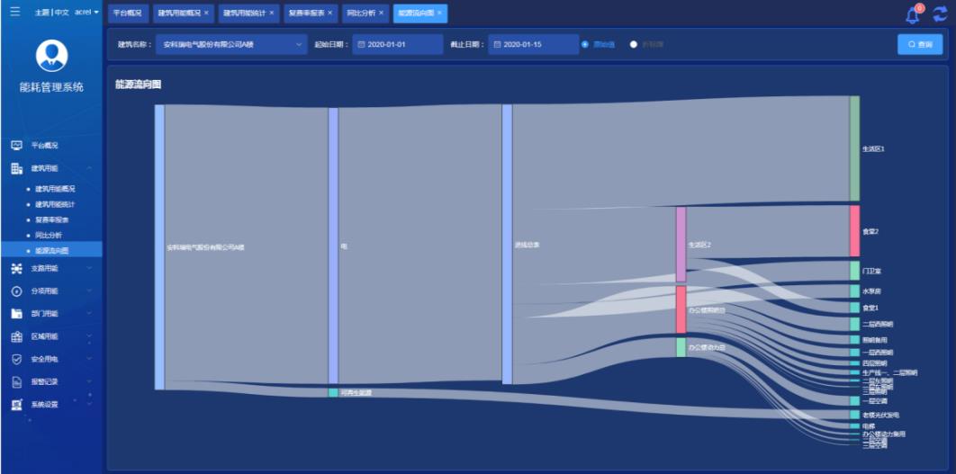 能源流向图展示单栋建筑Z定时段内各类能源从源头到末端的的能源流向,支持按原始值和折标值查看。