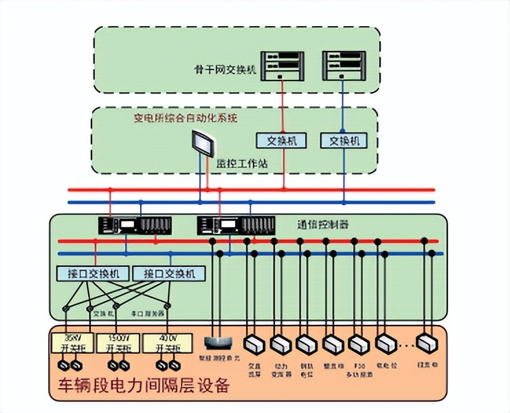 变电所综合自动化系统分布于全线各变电所,对本所电力设备进行的控制、监视(可以监视临站环网设备);可独立运行,无人值守。系统由一个监控工作站、2个冗余通信控制器、间隔层设备组成。监控工作站部署本所数据库正本,通过所内管理层网络与通信控制器通信,通信控制器通过变电所内现场总线将所内的间隔层设备连接起来。