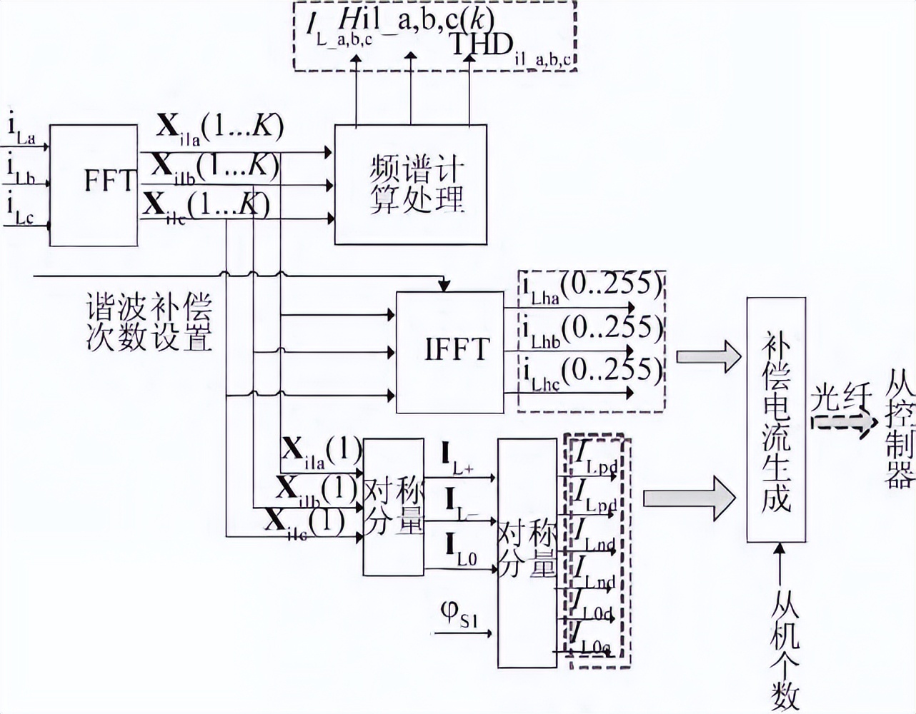 主控制器采集负荷电流后进行FFT变换,根据设置的补偿次数,对相应次数的分量进行处理,即如果不补偿该次谐波,则将该次谐波分量清零,然后对剩余的分量进行逆FFT变换,则得到谐波补偿电流参考值。同时对FFT变换后的各次谐波分量的有效值和总THD进行计算并显示。另外为补偿负荷的无功电流,主控制器对FFT变换的基波分量在进行对称分解,从而得出负荷电流的无功分量,然后将其和补偿谐波分量进行耦合,得到总的补偿电流,*后根据补偿从机个数,算出每个从机的补偿电流并通过光纤下发。