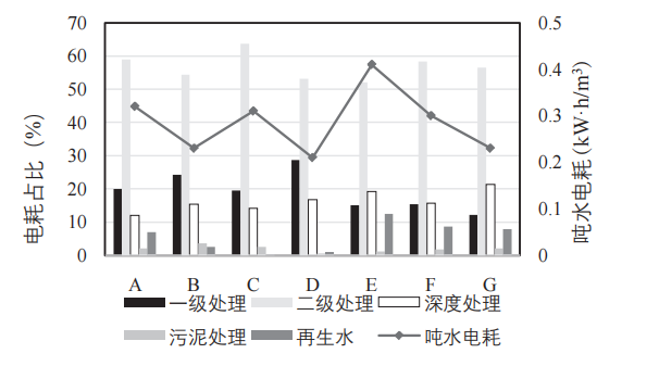 所选 7 座污水厂均执行《城镇污水处理厂污染物排放标准》(GB 18918—2002)一级 A 出水标准, 根据工艺流程,可以划分为一级处理、二级处理、深 度处理、污泥处理、再生水 5 个功能分区,分别安装 电量统计装置,进行为期 1 年的电耗记录。 污水厂吨水电耗和各功能分区电耗占比如图 2 所示。由图可知,所选污水厂 2017 年的吨水电耗 平均值保持在 0.2 ~ 0.45 kW·h/m3 。从五座处理工 艺为 A2O 的污水厂数据来看,吨水电耗与处理规模 相关性明显,处理规模 5 万 m3 /d 的 E 厂吨水电耗为 0.43 kW·h/m3 ,大于 10 万 m3 /d 的污水厂吨水电耗低于 0.3 kW·h/m3 ,处理规模越大,电耗相对越低。各污水 厂二级处理段的能耗较大,占总电耗的 50% ~ 65%, 其次为一级处理和深度处理段,平均占比分别为 19% 和 16%,部分厂再生水用电占比超过 5%