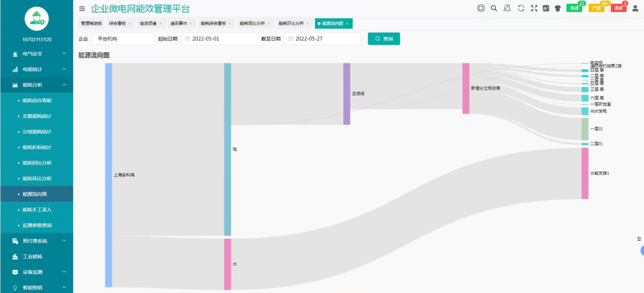 AcrelEMS-SW智慧水务能效管理平台通过搭建计量体系,采集污水处理厂能源数据,显示污水处理厂的能源流向和能源损耗,通过能源流向图帮助其分析能源消耗去向,找出能源消耗异常区域帮助其了解各工艺环节能源消耗量,并且可细化到楼层、车间、产线、班组、工序,计算产品单耗、单位面积能耗或万元产值能耗,从而计算出能耗总量和单位能耗。
