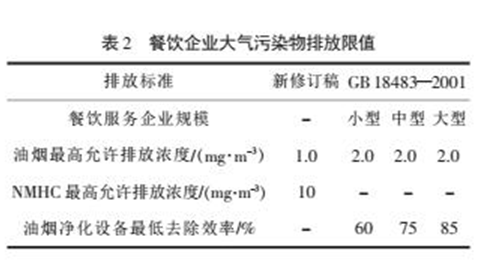 新修订稿中餐饮油烟允许排放浓度和油烟净化设备去除效率与 GB18483—2001 的比对见表2。