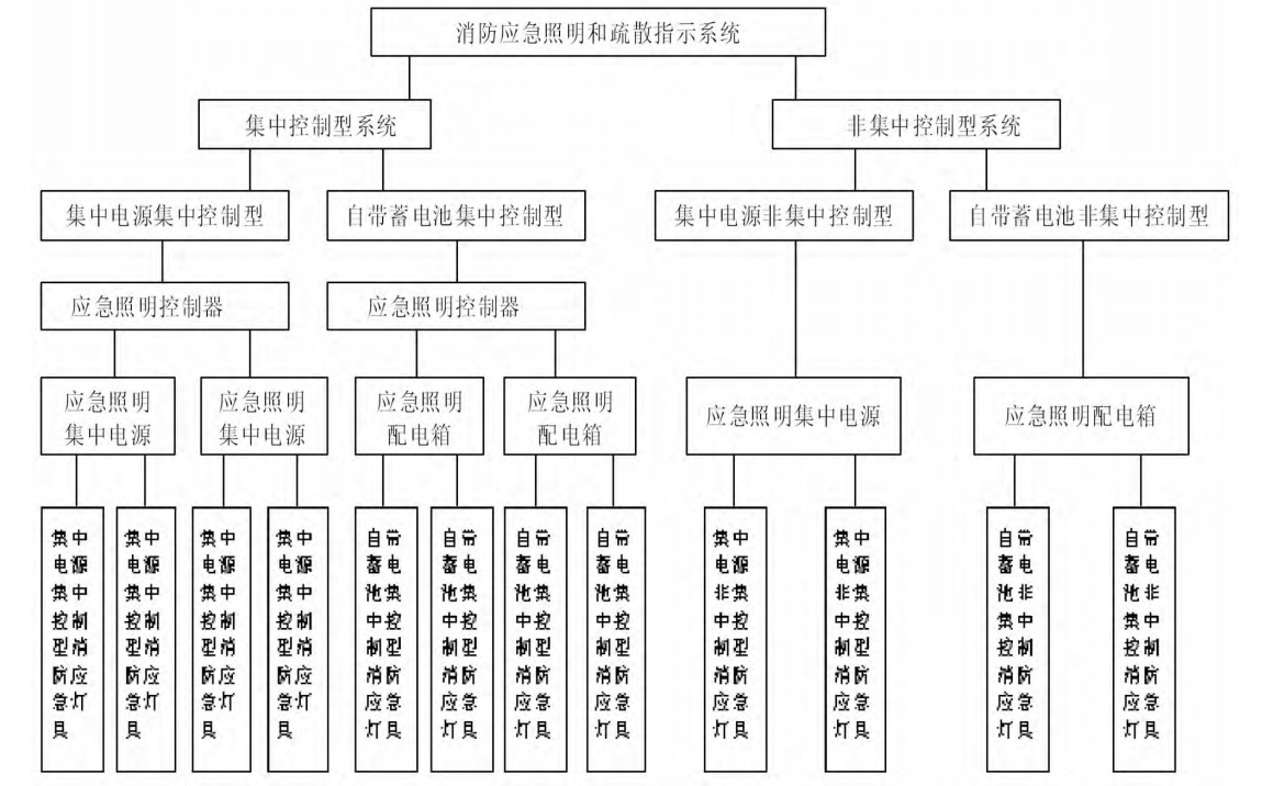 消防疏散系统是为人员疏散和发生火灾时仍需工作的场所提供照明和疏散指示的系统,该系统是由消防应急照明灯具、消防应急标志灯具、配电装置和控制装置等部分组成。消防疏散系统按照消防应急灯具的控制方式可以分为集中控制型系统和非集中控制型系统,按消防应急灯具的供电方式可以分为集中电源型和自带电源型消防应急灯具。消防疏散系统分类见下图