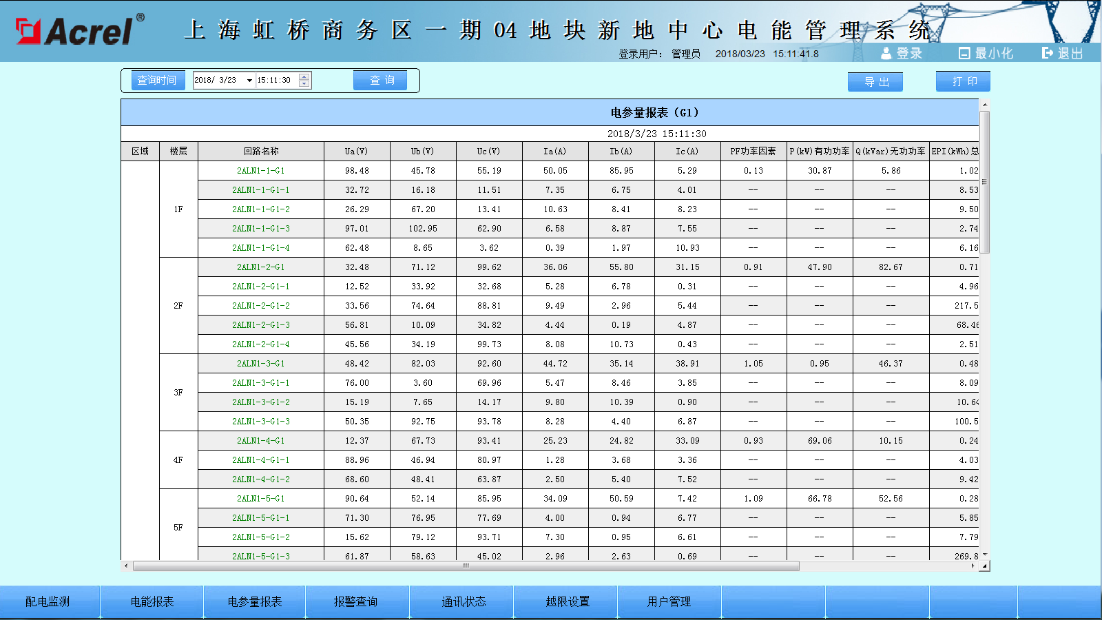 参数报表反映了本项目监测回路的在过去某时间点的运行数据,通过当前或者过去某时间点的实时参量数据反映回路状态。主要的数据包括:三相电压,三相电流,电能,有功功率,无功功率,功率补偿因数,频率。界面如图4所示