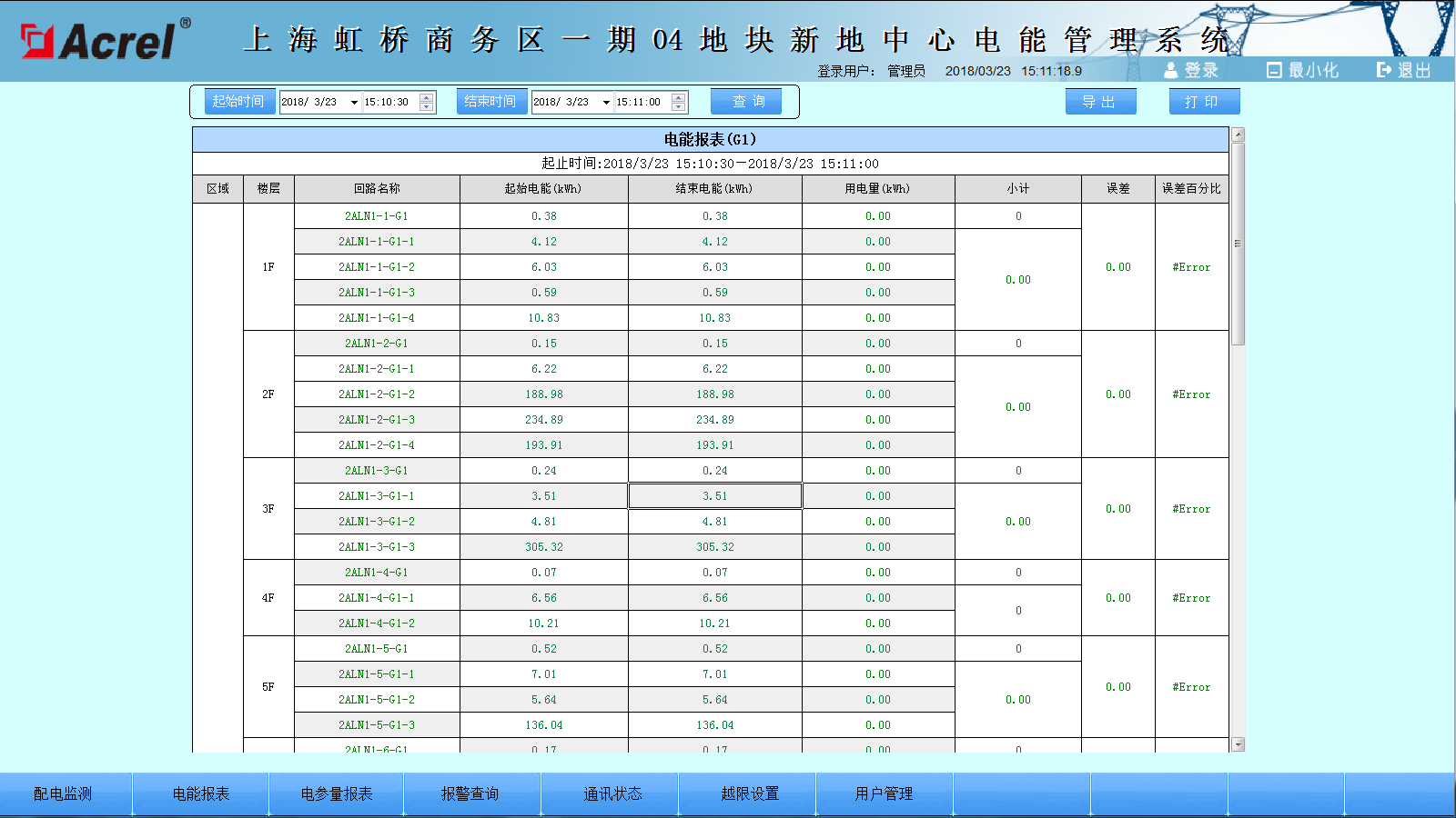 电能报表是对用电量的管理以报表形式呈现,该报表可以实现系统运行期间的任意时间段内的月抄表,日抄表,小时抄表等功能,且可以Excel形式导出或打印。界面如图5所示。