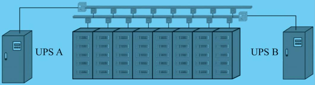 数据中心智能母线供配电系统采用树干式的供配电系统,UPS总输出配电柜至各IT设备机柜之间采用两条干线(智能母线)连接的配电方式。其优点是消耗的有色金属导体量相对较少、安装施工快捷方便、即插即用、系统扩展灵活,可满足不同承租用户的个性化业务用电容量,易于扩展与变更。与电力电缆相比,智能母线可靠性更高、工程生命周期长,并且可重复利用。其缺点是智能母线主干线发生故障时,影响范围大,但母线干线的故障概率很低。数据中心未端配电智能母线拓扑图如图4 所示。优点:取消配电列头柜,节约占地面积,争取了更多的盈利性机柜;开关控制及数据采集分布于始端箱和各插接箱,避免互相影响;避免了强电在架空地板下敷设,主动发热少,对制冷造成的负担小,有效降低数据中心能耗和PUE值;安装方便快捷,工期大大缩短;插接箱模块化,实现分支数量及容量随时调整;内部均为铜排输电,安全性能更高。