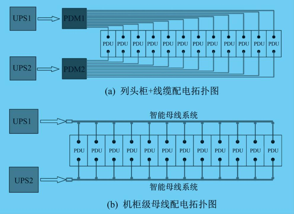 数据中心未端配电列头柜采用放射式的供配电系统,UPS总输出配电柜直接放射敷设至配电列头柜及|T设备柜。其优点是各负载之间独立受电,若发生系统故障,切除故障回路,缩小停电范围,不影响其他回路,W全M足国家相应规范对|T设备重要负荷的用电技术要求。其缺点是分支线路多、有色金属导体消耗量大、施工安装工艺复杂、系统可扩展性差,不能满足不同业务的用电容量需求,分期实施时需要把末端电力线缆一次敷设到位,系统灵活性差。此外,传统配电列头柜加电力电缆形式的供配电系统中,配电列头柜需要占用数据中心的空间资源。