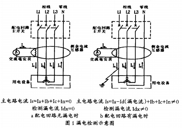 漏电监控报警主要是利用装在被监控配电线路上的剩余电流互感器检测线路上的漏电流来实现。剩余电流互感器本质上是一个高灵敏的电流互感器,它能检测出配电线路上小到几毫安或十几毫安的微小漏电流,而漏电流检测则是依据剩余电流原理来确定的。当配电线路中3条相线和1条零线共同穿过剩余电流互感器的铁芯线圈时,在正常情况下它们的电流矢量和为零,则互感器的线圈不会感应出任何电流;但当任何一条相线或者零线有一部分电流在互感器之后分流到大地(即漏电),此时在互感器处它们的电流矢量和就不为零了,而互感器的线圈也就感应出相应的漏电电流,故称为剩余电流。把检测到的剩余电流处理后与监控装置设定值进行比较,一旦达到和超过设定值,与剩余电流互感器连接的电气火灾监控探测器即发出漏电报警,并同时输出脱扣跳闸信号切断相应故障线路电源。漏电检测如图1。