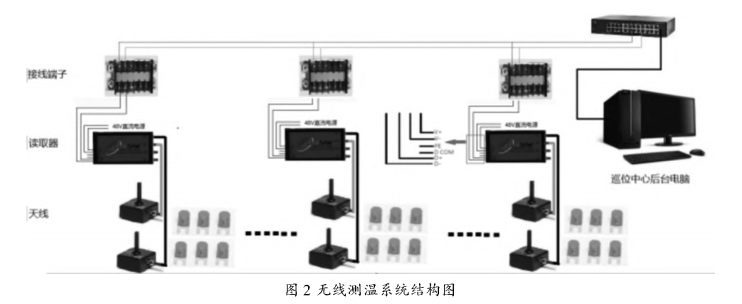 如图2所示,整个无线测温系统共分为三层:一层:无线测温传感器采集测温位置的温度数据;二层:数据读取器通过数据接收天线,接收来自无线测温传感器发送的数据并进行相关处理;三层:站内所有数据读取器通过RS485进行串联,然后将数据读取器处理过的所有数据发送到站内交换机,之后传送到达站内测温工控机进行实时显示。