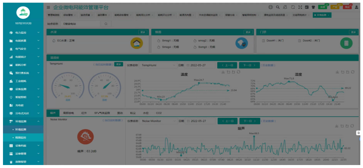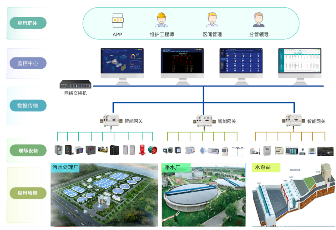 监测变压器、水泵、鼓风机的电流、电压、有功/无功功率、功率因数、负荷率、温度、三相平衡、异常报警等数据。
