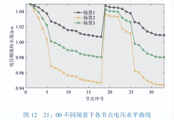 由于大量负荷突然接入使各节点电压发生偏移现象,因此对比较大负载量时刻(21.00)各节点电压偏移情况进行对比更有意义,结果如图12所示。
