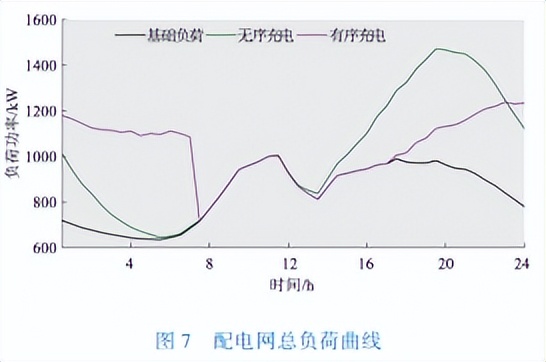 电动汽车以不同方式充电的负荷曲线及配电网总负荷曲线如图6、图7所示。由图6和图7可知,通过动态价格的引导,电动汽车充电行为趋于有序化,车主对充电时间段的选择逐渐向夜间转移,负荷峰值水平大幅度下降,说明新型电价的提出可以使车主的用电行为不再大面积集中,系统总用电负荷曲线相对变得平缓,有削峰填谷的效果。