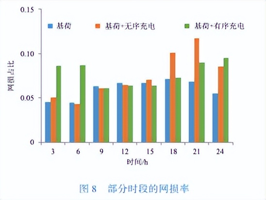 将IEEE33节点配电网模型的节点负荷参数和优化后的有序充电负荷数据导入MATLAB软件语言编程,对比以下3种场景下的配电网电压偏移及网损。场景1:配电网内未接入电动汽车负荷。场景2:配电网内接入无序充电负荷。场景3:配电网内接入有序充电负荷。图8表示部分时段下3种用电方式的网损率。可见18.00-24.00由于无序充电负荷的接入使得网内网损明显升高。原因是车主归程后的无序充电行为与用户基础用电行为的一致性导致网内用电功率激增。09.00-21.00时,对比接入无序充电负荷和有序充电负荷,后者可有效降低配电网网损,尤其在电价高峰时段21.00网损率下降了2.77%,效果比较显著。说明多时段分时电价的提出引导车主有序充电对调节配电网网损具有一定效果。