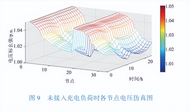 由图9可知,场景1配电网未接入充电负荷时的电压偏移都控制在±7%以内,纵横对比没有发现严重的电压偏移现象,但是节点18和19在20.00-21.00时间段上有局部节点处在越限边界。由图10可知,场景2中配电网内接入无序充电负荷时,节点13-19和28-33在晚间出现电压越限情况,原因是无序充电负荷的高峰期恰巧与网内基础负荷用电的高峰期时段相叠。
