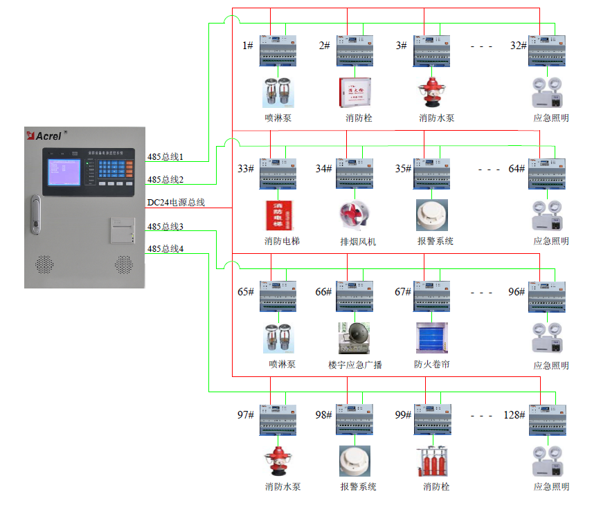 消防设备电源监控监控系统采用消防二总线,以建筑为单位设置区域分机采集消防设备电源状态,区域分机通过二总线接收多台传感器的电压、电流信息和开关状态信息,以此实现对消防设备电源工作状态的实时监视。