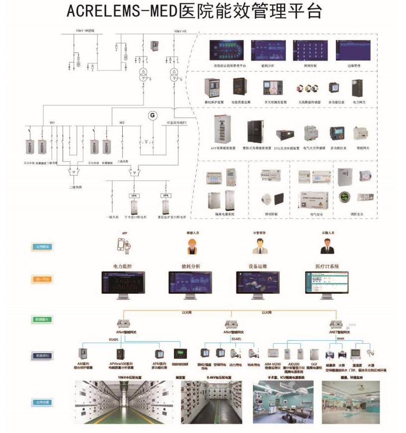 AcrelEMS-MED医院能源管理平台充分结合《医疗建筑电气设计规范》《绿色医院建筑评价标准》、《医院建筑能耗监管系统建设技术导则》等行业规范、根据医院用户需求以及能源管理部门要求,采集分析能源、能耗、能效数据,监测以电能质量、智慧用电相关指标以及其他用能指标,并与国家能源政策与用能模式改革结合。能够辅助医院后勤管理人员进行能源供应系统及设备的运行管理工作,帮助医院管理层实时掌握医院的能耗情况,为医院能源信息化建设和节能管理提供了良好的技术平台。