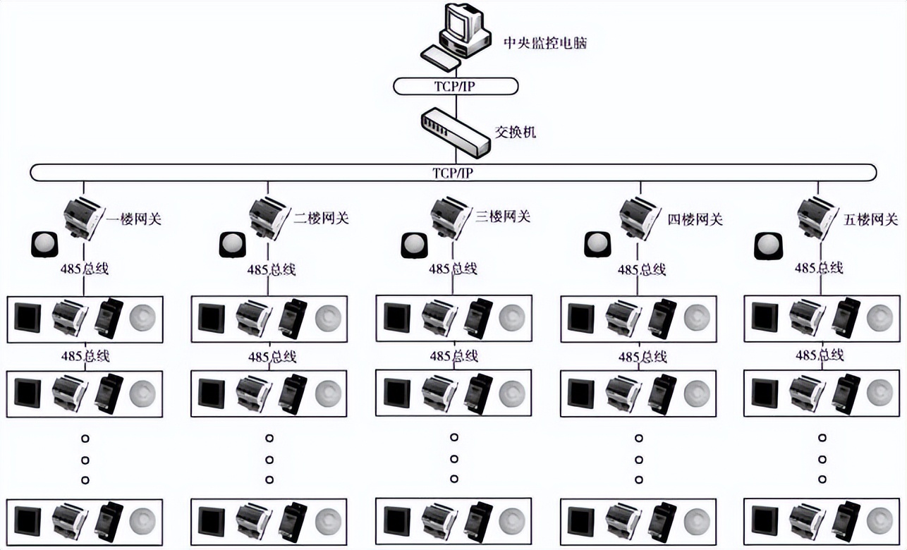 教学楼五层分别各用一个网关经总线将各个教室的智能照明设备连接起来,再由监控室的电脑通过后台FLCS智能照明控制软件进行监控。如图1所示。