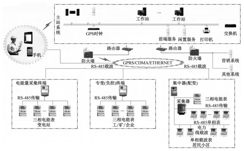 矿井电能管理系统采用分层分布式网络结构,具有良好的可靠性与实时性,主要由现场设备层(电能计量终端) 、通信管理层(数据采集终端) 和主控层(电能管理平台)3部分组成,见图1。