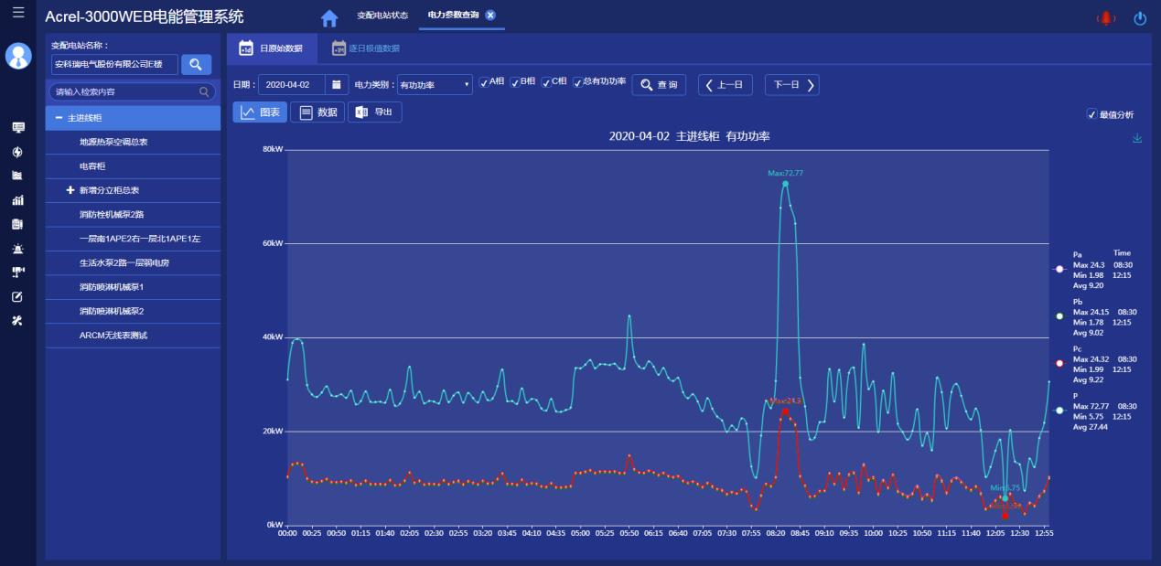 系统对配电系统总进线、主变压器、重要负荷出线的运行状态进行在线实时监视,用曲线显示电流、变压器运行温度、有功需量、有功功率、视在功率、变压器负荷率等运行趋势,分析变压器负荷率及损耗,方便运行维护人员及时掌握运行水平和用电需求,确保供电安全可靠。