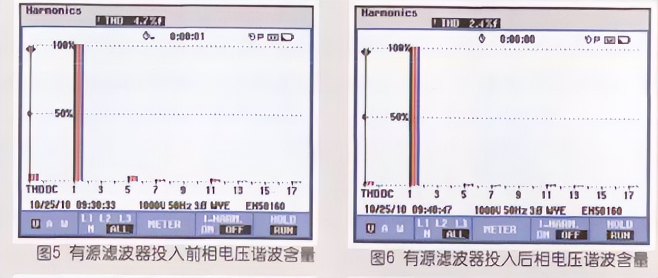 2)三相电压谐波含量前后对比,见图5、图6。