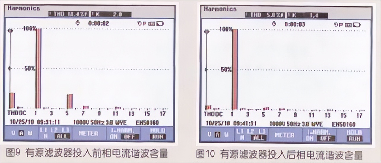 4)三相电流诺波含量前后对比,见图9、图10。