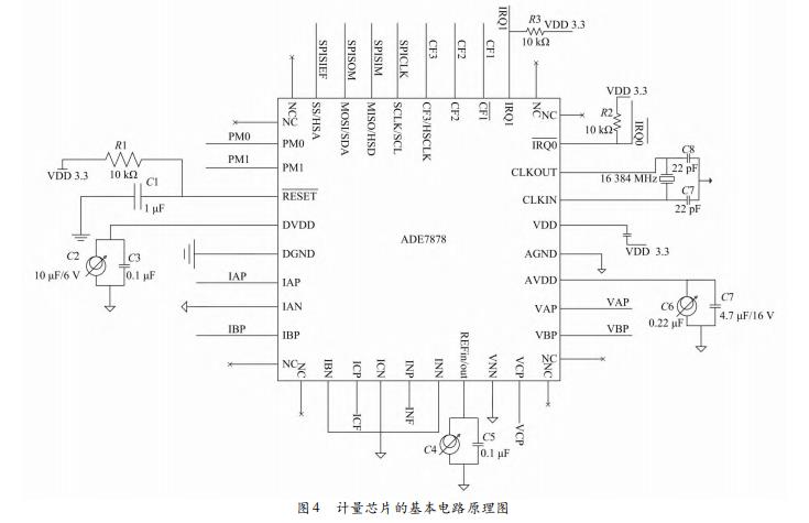 计量功能模块以计量芯片ADE7878为核心,该芯片的功能十分强大,具备很好的信号处理能力。对于电能表的电压和电流有效值的测量、有功功率和视在功率的测量,该芯片具有十分明显的计量优势。芯片的正常模式、省电模式和低功耗模式W全M足电能表对节能降耗的要求。该芯片输入电压的变化幅值范围为-0.5~0.5V,晶振频率为16.4MHz。芯片的RSET管脚是复位输入管脚,芯片的CF1管脚和CF3管脚是频率校准的逻辑输出管脚。CF1管脚和CF3管脚完成频率校准逻辑输出的功能。计量芯片的基本电路原理图如图4所示。