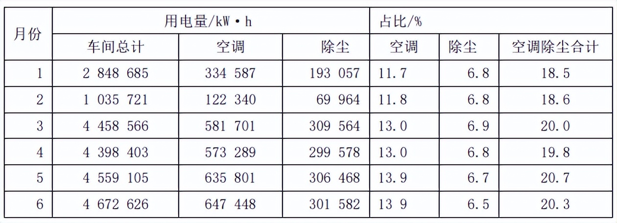 根据纺纱各工序设备的具体特点,设备配备功率的保险系数和负荷系数都存在差异,造成设备装机功率和实际能耗相差较大,运行中各设备的实测用电量真正体现了设备的实际能耗情况。以车间正常满负荷生产中细特集聚纺纱为基础,2020年1月至6月我们对车间总用电量和空调除尘系统用电量进行了实测统计,如表2所示。