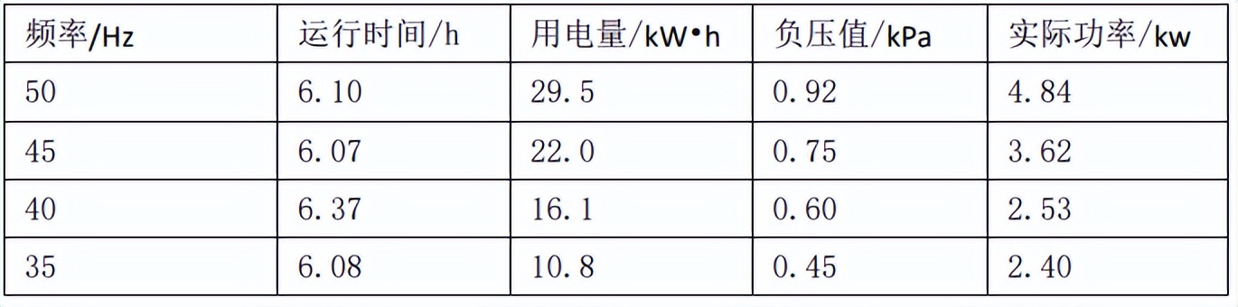 表5吸棉风机不同频率能耗试验