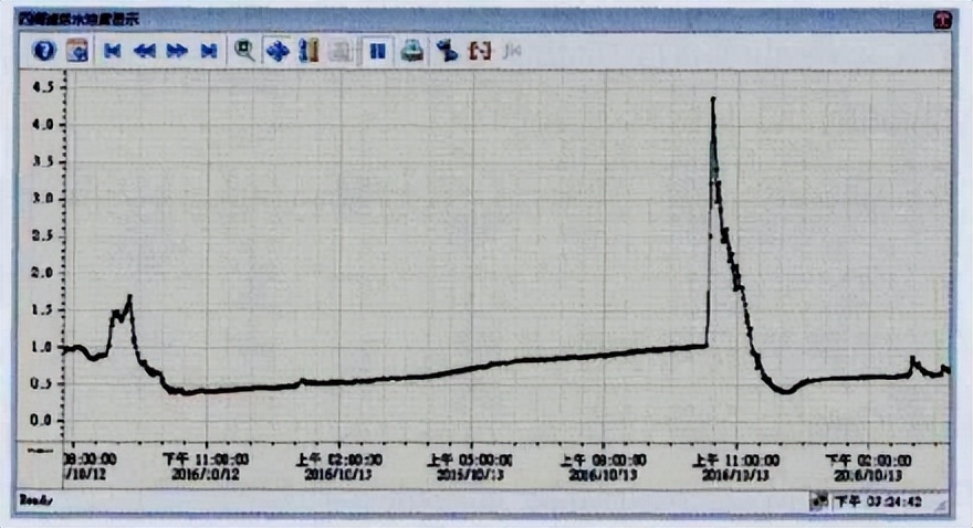 从历史曲线看过滤效果,以四阀车间为例,反冲后,滤后水浊度由0.4NTU~jlNTU用时lid'时。若监测曲线突然发生变化,即图中梯度迅速时,说明滤池滤速变慢,过滤效果变差。需首先考虑沉后水是否发生变化,原水水质是增大否恶化,然后判断滤池是否出现故障。